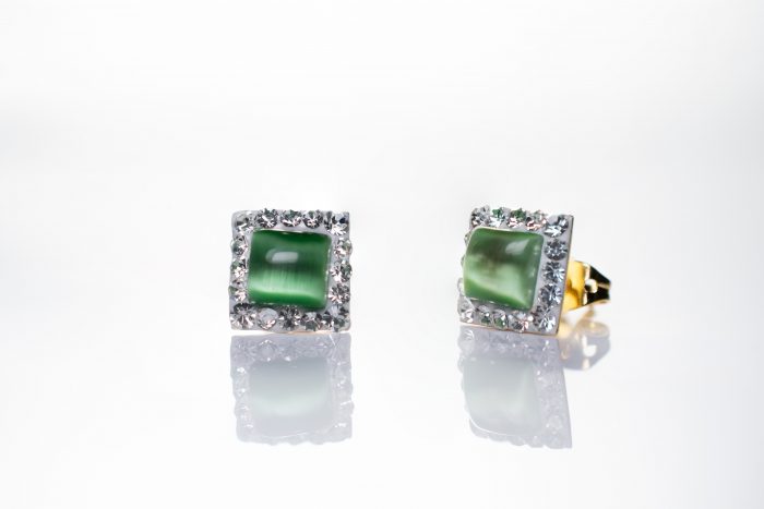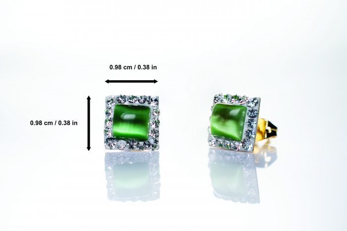 - Arete en forma cuadrada de color verde decorado con finos cristales.